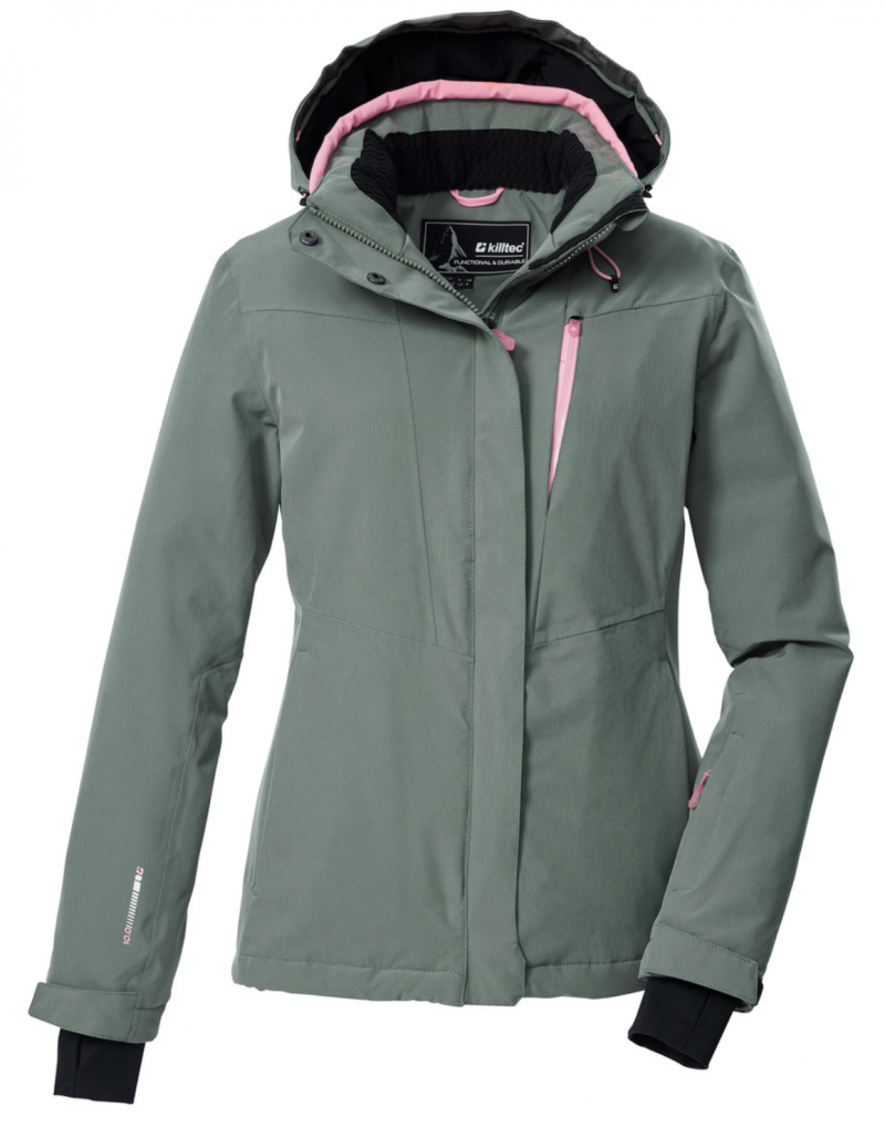 The killtec women’s ski jacket is ideal for all winter activities. It is breathable with a water vapor permeability of 3,000 g/m²/24 h. It is also waterproof and windproof with a 10,000 mm water column and taped seams (our tip: the jacket should be waterproofed from time to time). The non-slip, rubberized snow skirt protects against wind and snow. The hood is adjustable and can be zipped off if required. The adjustable cuffs are equipped with comfortable Lycra cuffs with thumb holes. Various closable pockets offer space for ski goggles, ski pass, cell phone etc. The concealed zipper has a practical chin guard. This jacket has a PFAs-free impregnation and is partly made from recycled material.
